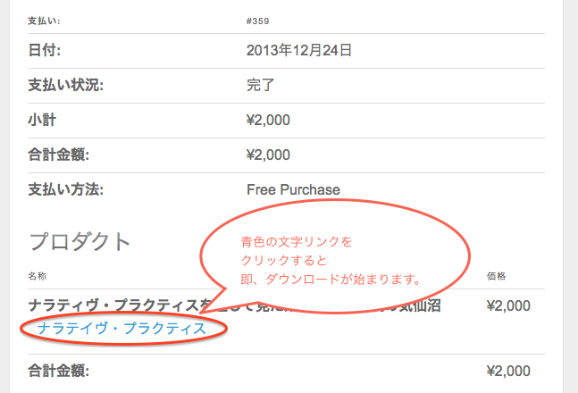 - 決済完了後、表示される「購入確認」ページのご購入済プロダクト一覧にある書名(リンク)をクリックすることで、ただちにダウンロードが始まります(このページはブラウザを閉じてしまうと再び開きませんので、ご注意ください。また、このページは「印刷・製本サービス」をご利用の場合には表示されません。)。